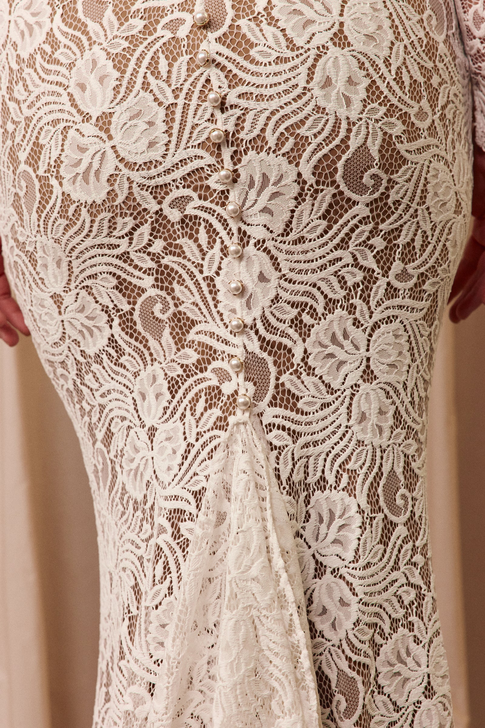 - 85 pearl-effect buttons adorn the centre front and back, accentuating the gown’s length