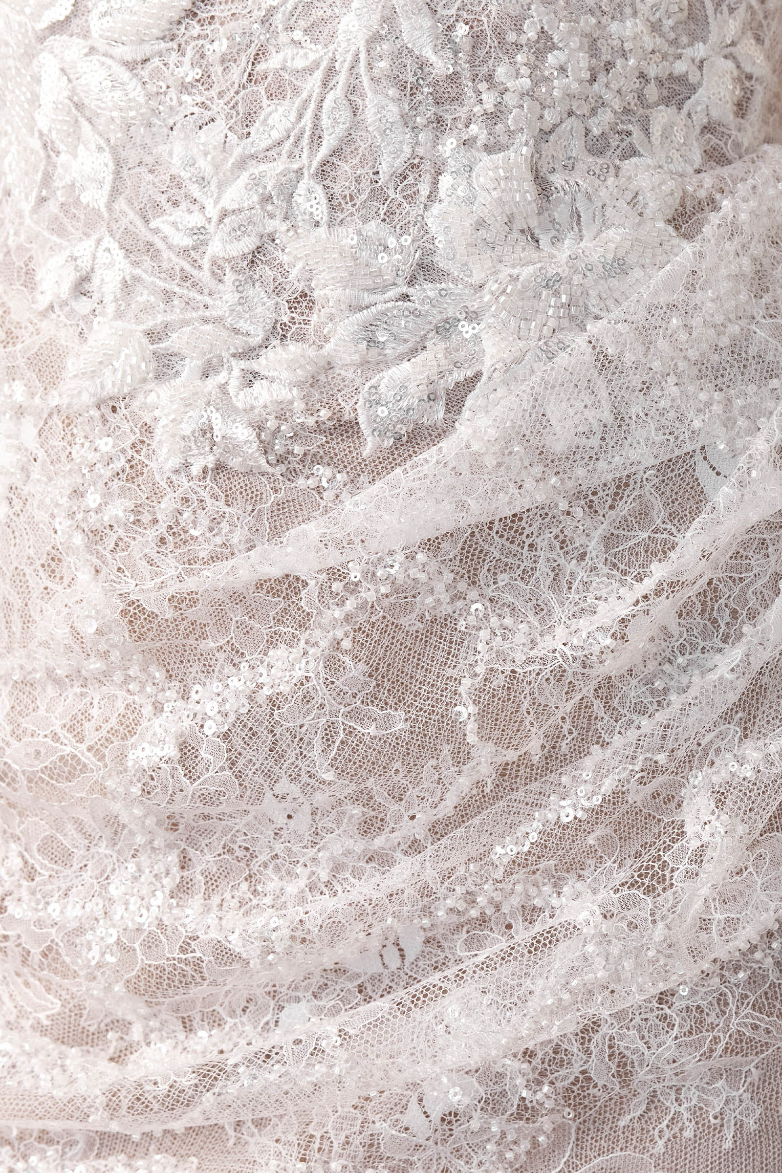 - Double-layer lace with unique abstract beading and delicate Chantilly lace
