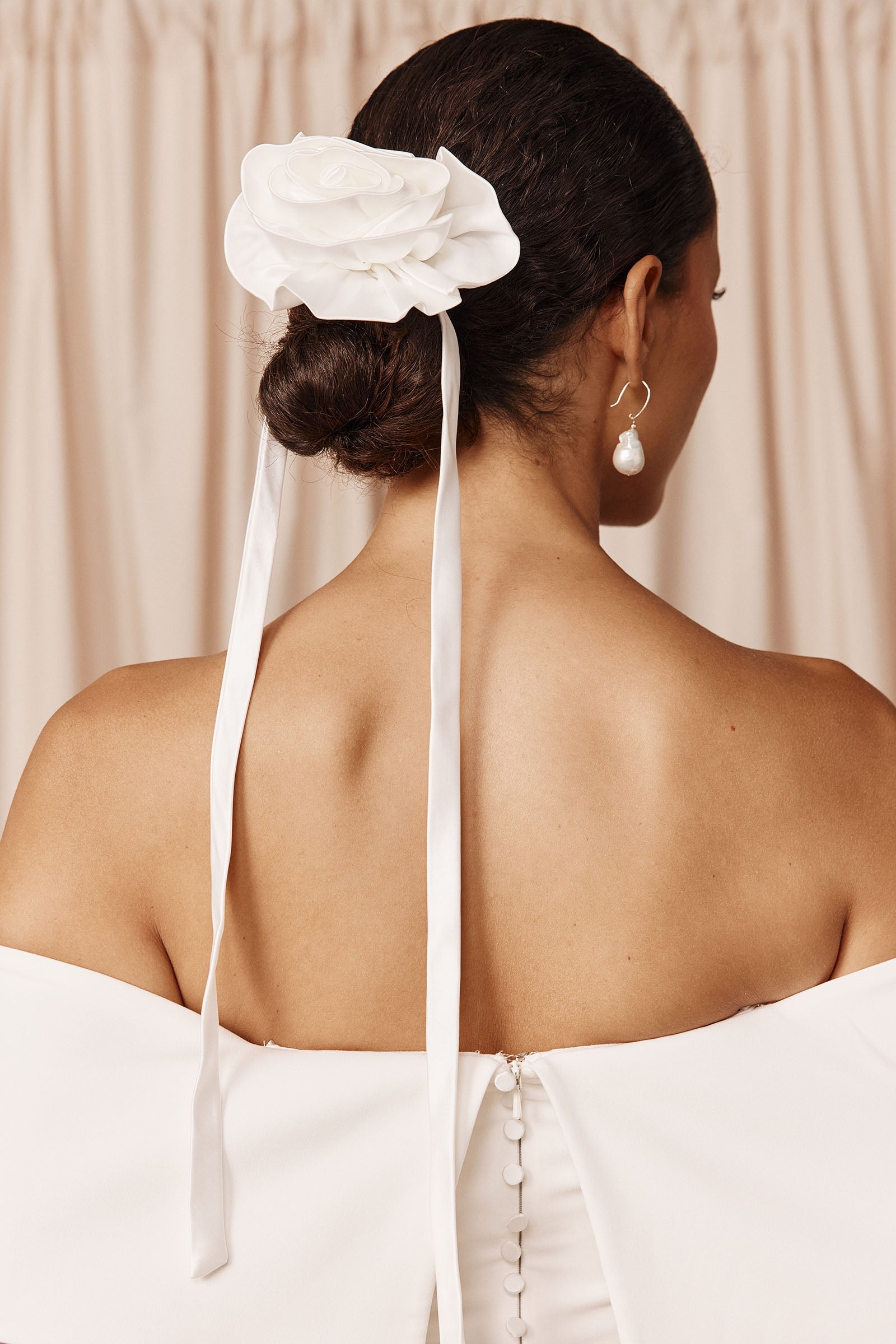 “Our beautifully hand crafted satin rose makes for a perfect touch of soft glamour and femininity. Both striking and elegant the rose pairs perfectly with all Grace gowns styled as a choker or hairpiece.”