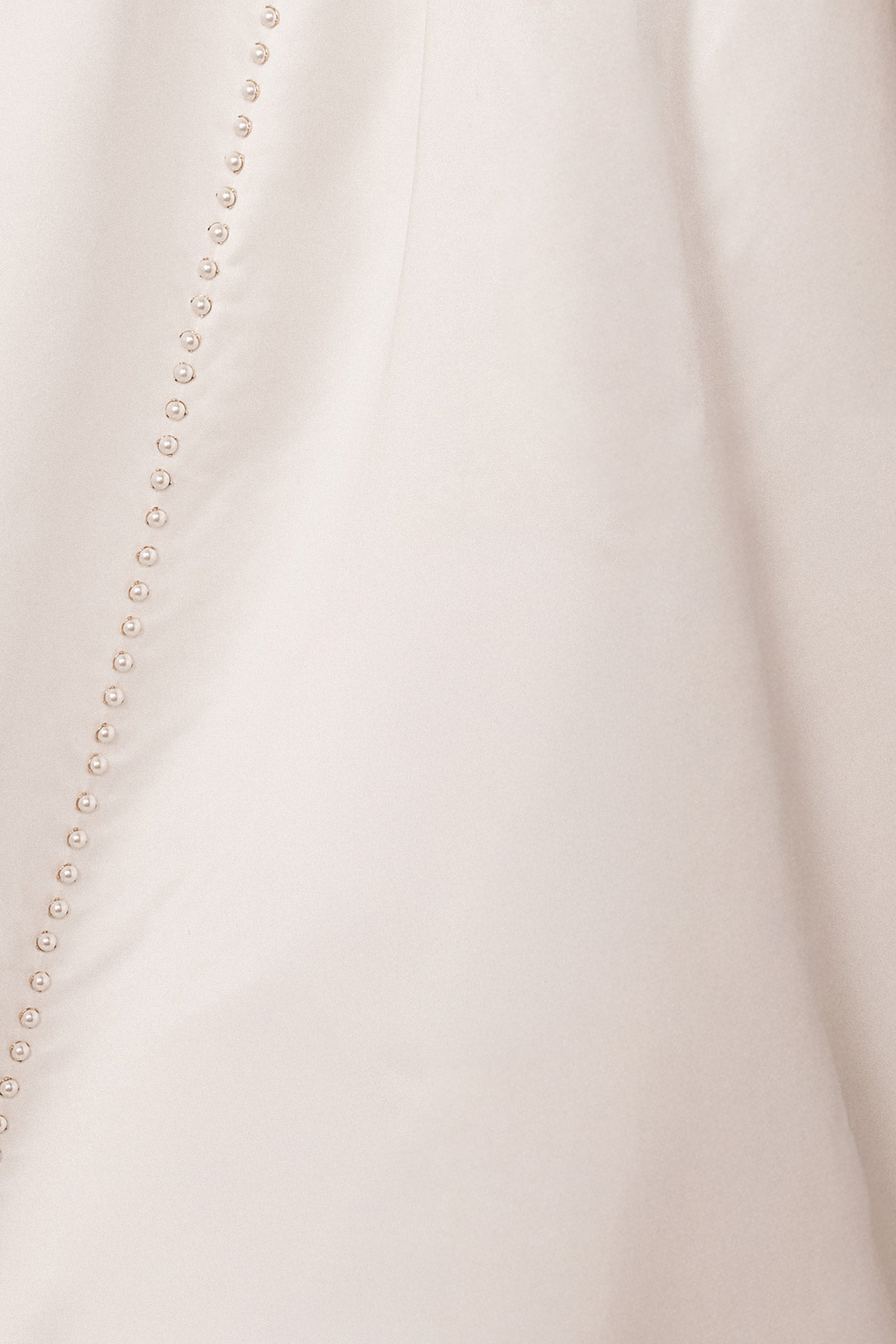 - Luxurious ivory Mikado satin with delicate lace eyelash trim at neckline