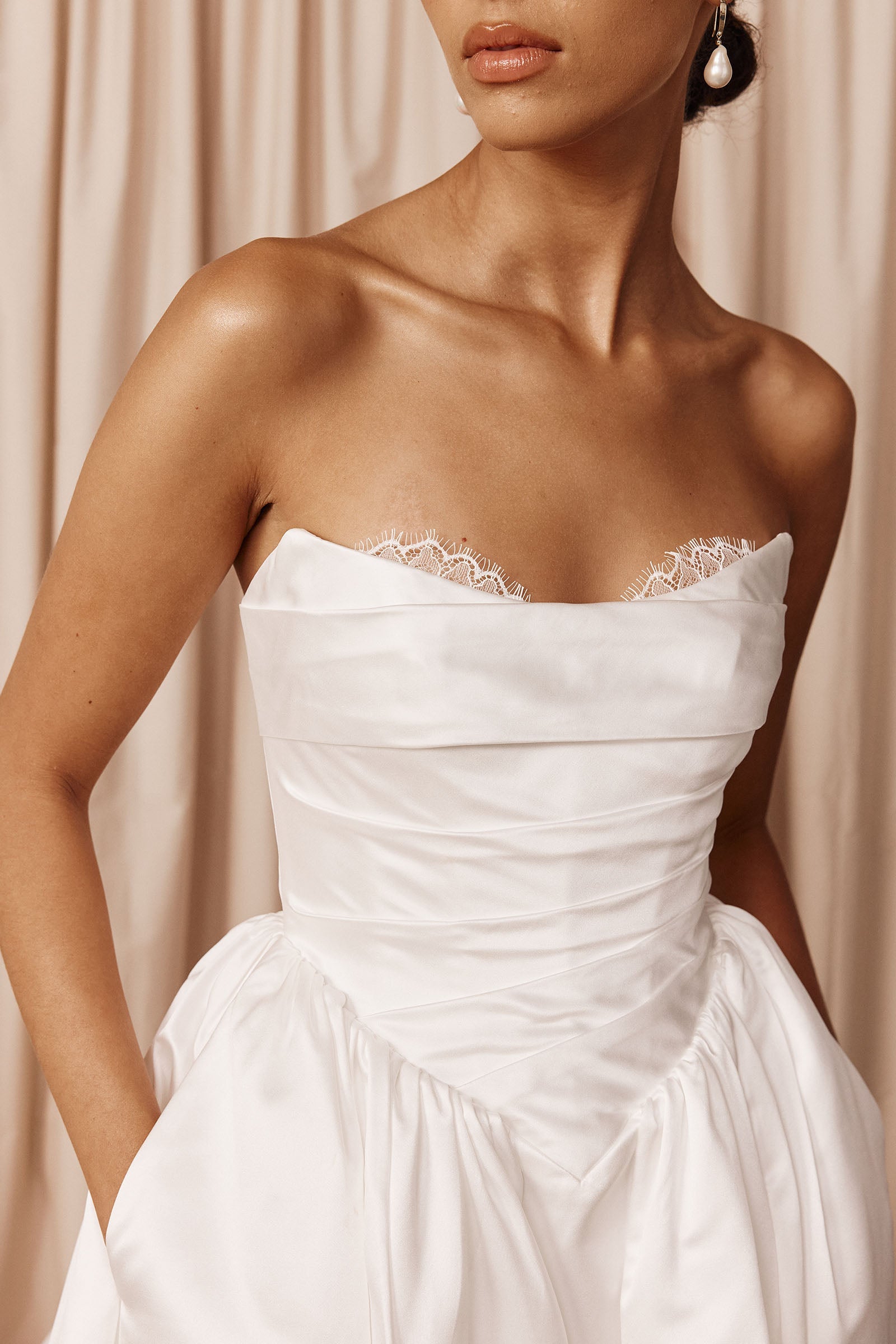 - Luxurious ivory Mikado satin with delicate lace eyelash trim at neckline